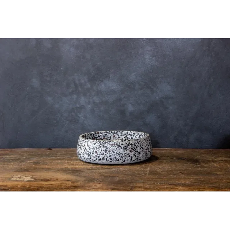 Biała okrągła doniczka z marmurem niska Dodo – Kama 4 | Elegancka misa betonowa