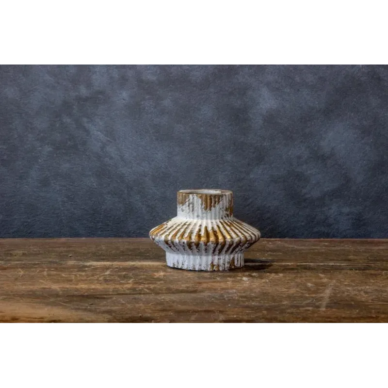 Dodo – HW 1 to kompaktowy, złoty świecznik dekoracyjny, który łączy surowość betonu z subtelnym, artystycznym wykończeniem. Wykonany z trwałego betonu portlandzkiego i ręcznie malowany w tonacji bieli oraz złota, doskonale sprawdza się jako detal w nowoczesnym, eleganckim wnętrzu.