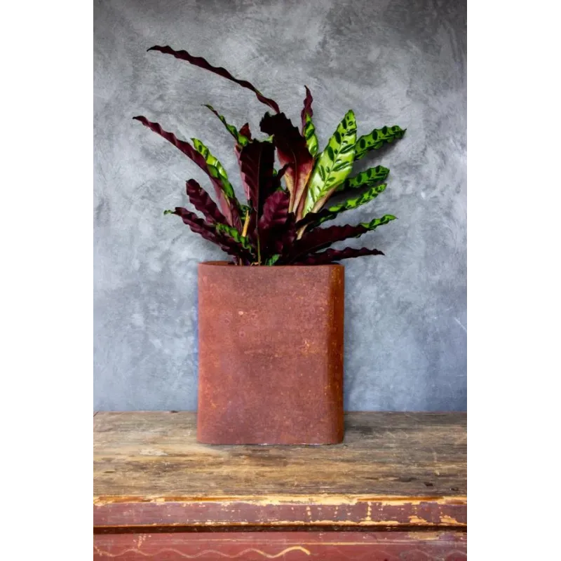 Donica cortenowa Kortes - Rust L to ręcznie wykonana loftowa donica o unikalnym efekcie rdzy. Dzięki wytrzymałej konstrukcji i wyjątkowemu designowi, doskonale pasuje do wnętrz w stylu industrialnym i nowoczesnym. Idealna do salonu, biura i zakrytych tarasów. Ze względu na w pełni ręczne wykonanie, wymiary osłonki mogą różnić się o około ±1 cm. Projekt Rafaello Romano.