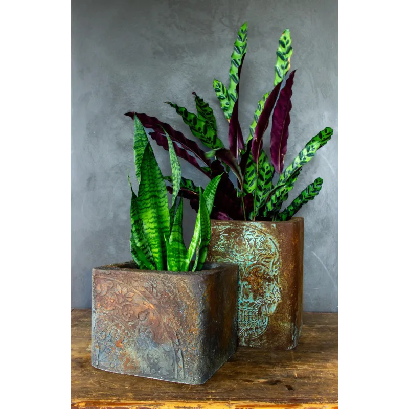 Donica cortenowa z czaszką 27x27x30 cm – loftowa dekoracja z efektem patyny