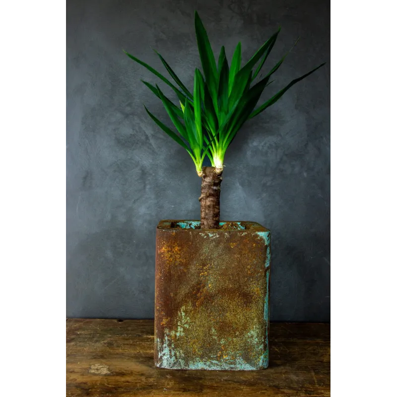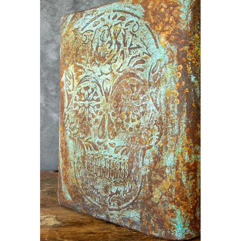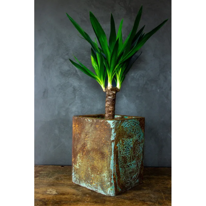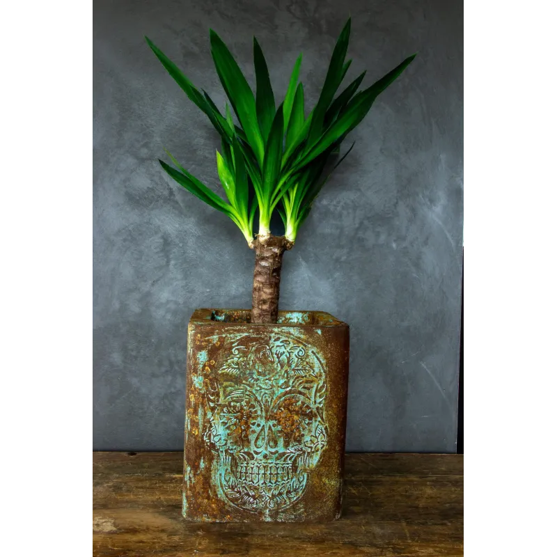 Donica cortenowa z czaszką z efektem patyny to ręcznie wykonana loftowa donica wykończona tynkiem betonowym z efektem corten i warstwą patyny, ozdobiona artystycznym motywem czaszki. Dzięki trwałej konstrukcji oraz oryginalnemu wzornictwu, doskonale pasuje do wnętrz w stylu industrialnym i alternatywnym. Idealna do salonu, biura oraz na zadaszone tarasy. Ze względu na w pełni ręczne wykonanie, wymiary osłonki mogą różnić się o około ±1 cm. Projekt Rafaello Romano.