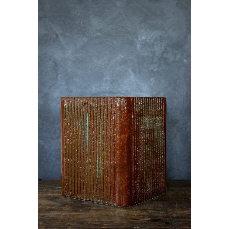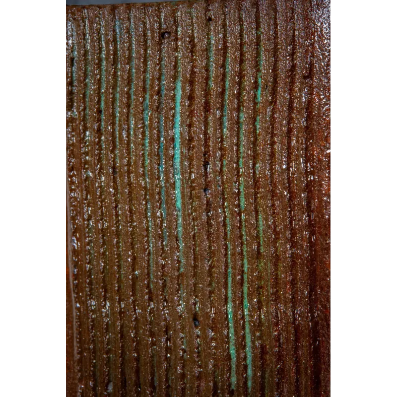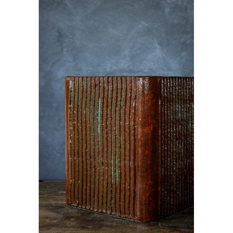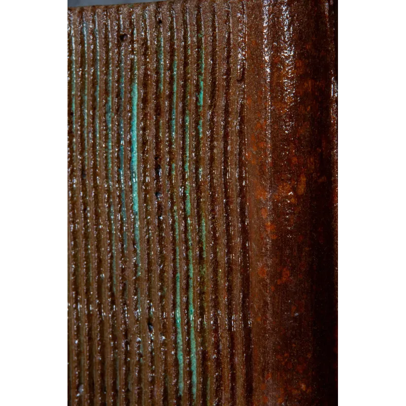 Ta donica do salonu łączy industrialny charakter z eleganckim wykończeniem przypominającym lakierowane drewno. Dzięki ręcznej produkcji każdy egzemplarz ma indywidualny charakter, a naturalne przetarcia w odcieniach rdzy i zieleni dodają mu głębi.