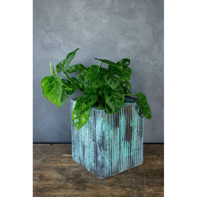 Ręcznie robiona turkusowa osłonka na doniczkę loft 25 x 25 x 30 cm z pionową strukturą. Lekka, odporna na UV, idealna do wnętrz i zakrytych tarasów. Ze względu na w pełni ręczne wykonanie, wymiary osłonki mogą różnić się o około ±1 cm. Projekt Rafaello Romano.
