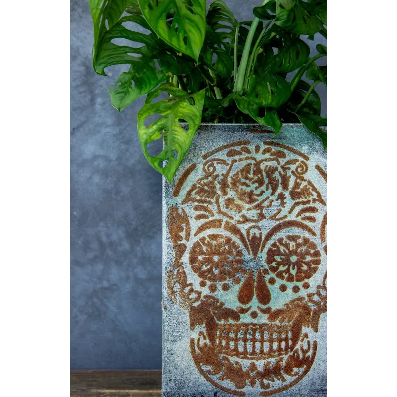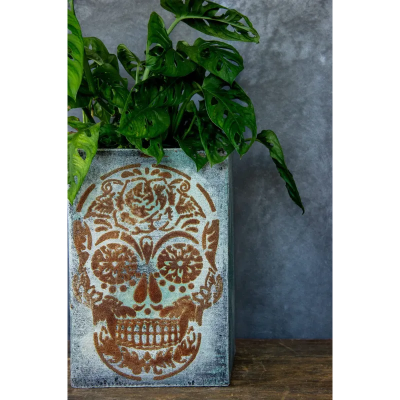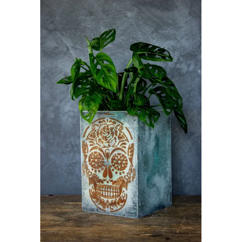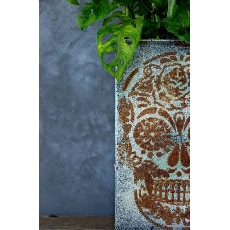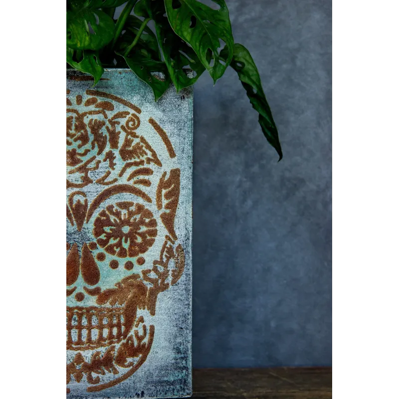 Osłonka na doniczkę z czaszką w stylu loft 21 x 21 x 30 cm – ręcznie robiona.