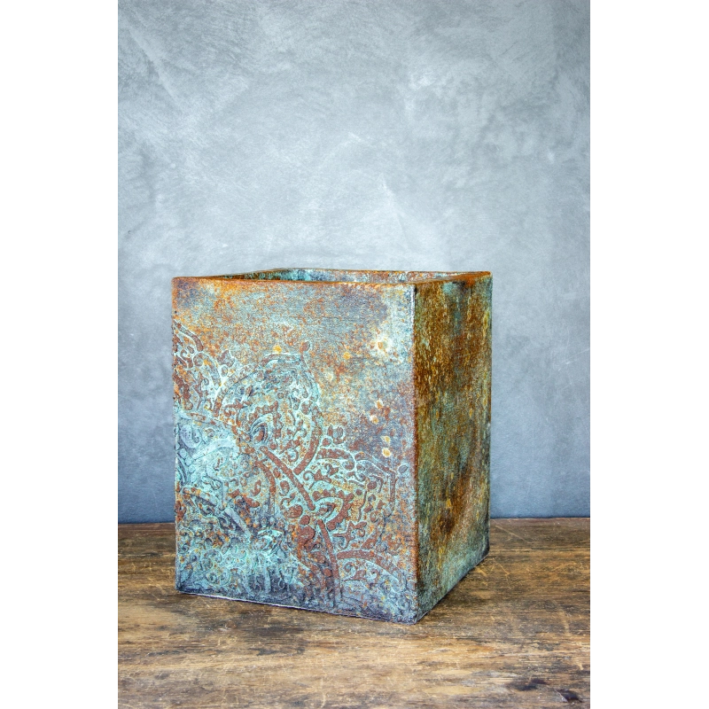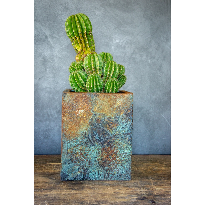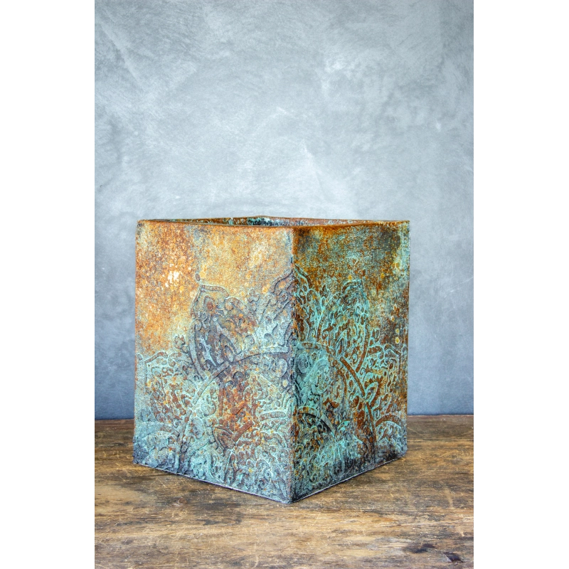 Osłonka na doniczkę duża z mandalą 25x25x30 cm – miedziana zieleń z efektem patyny