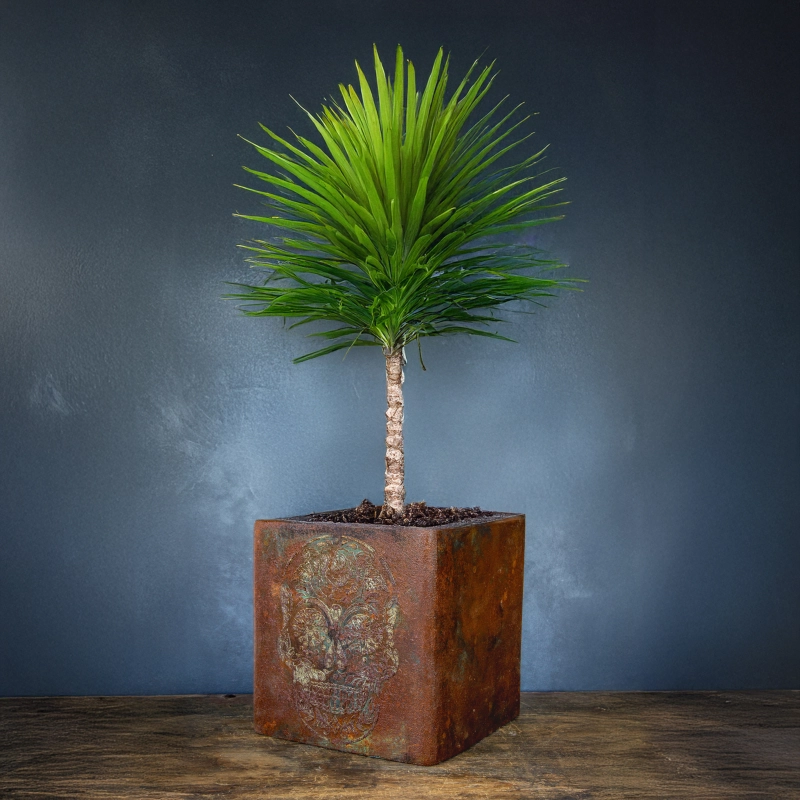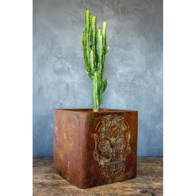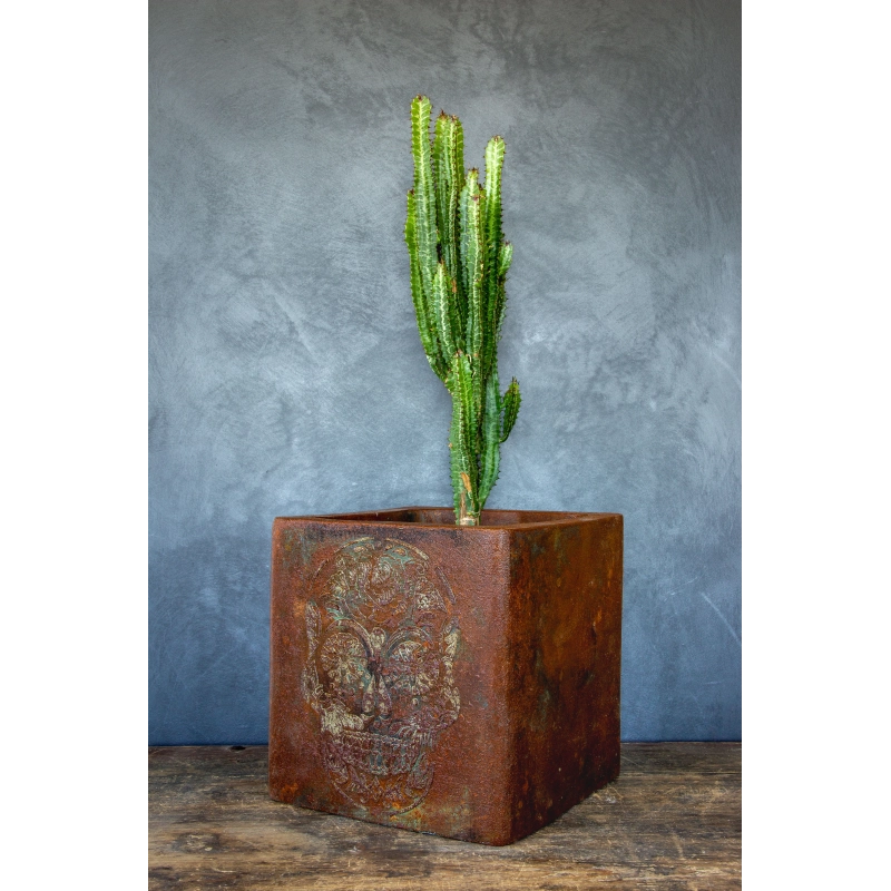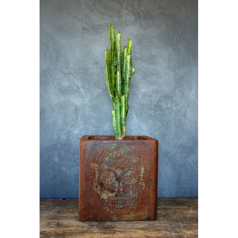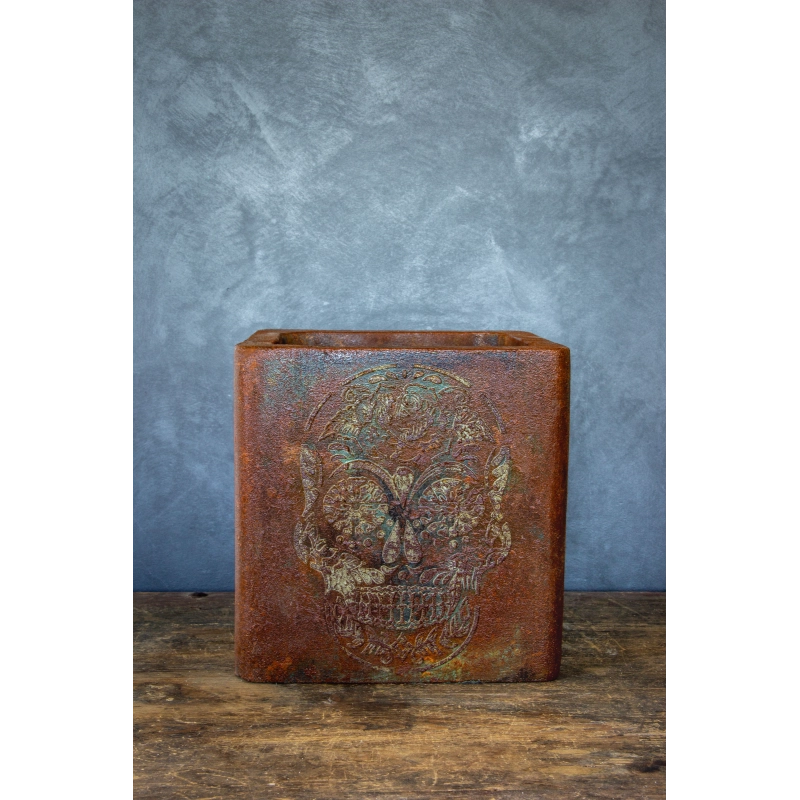 Ręcznie wykonana osłonka na doniczkę z motywem czaszki. Efekt kortenu z turkusową patyną, odporna na wodę i UV. Idealna do wnętrz i tarasów.