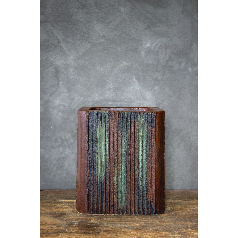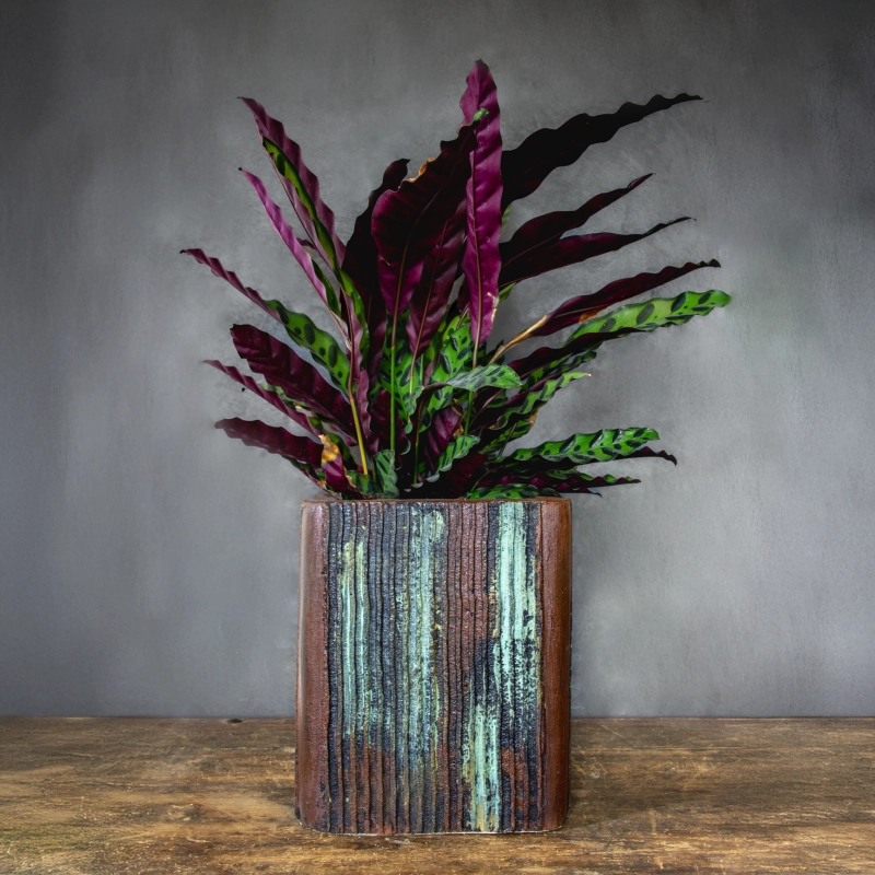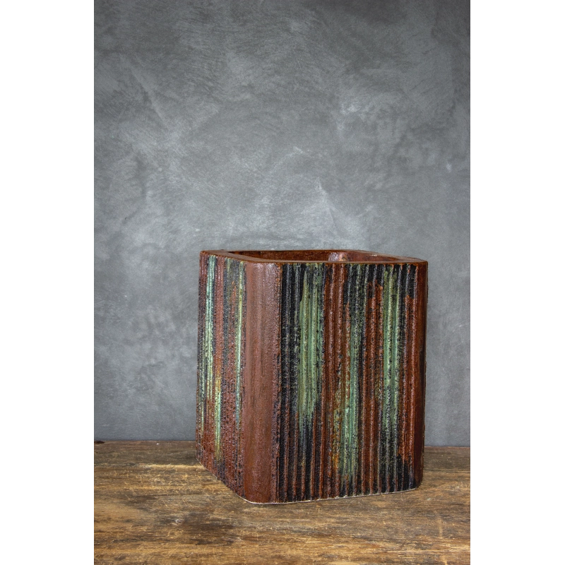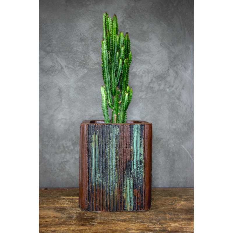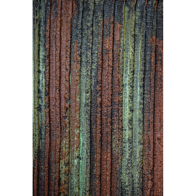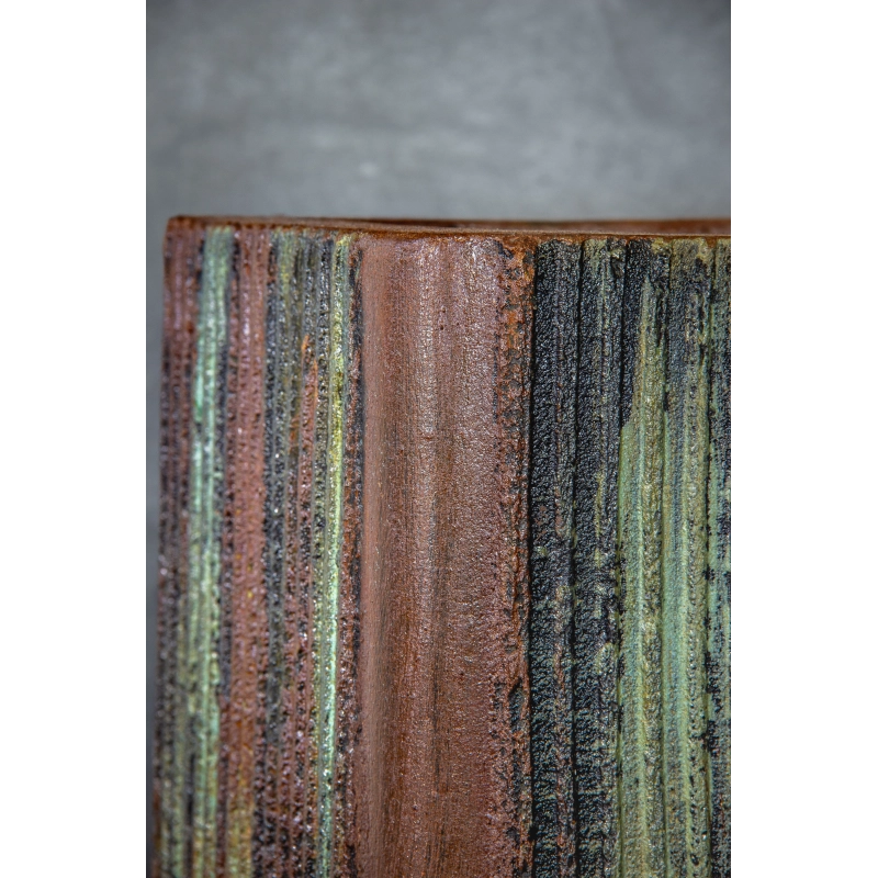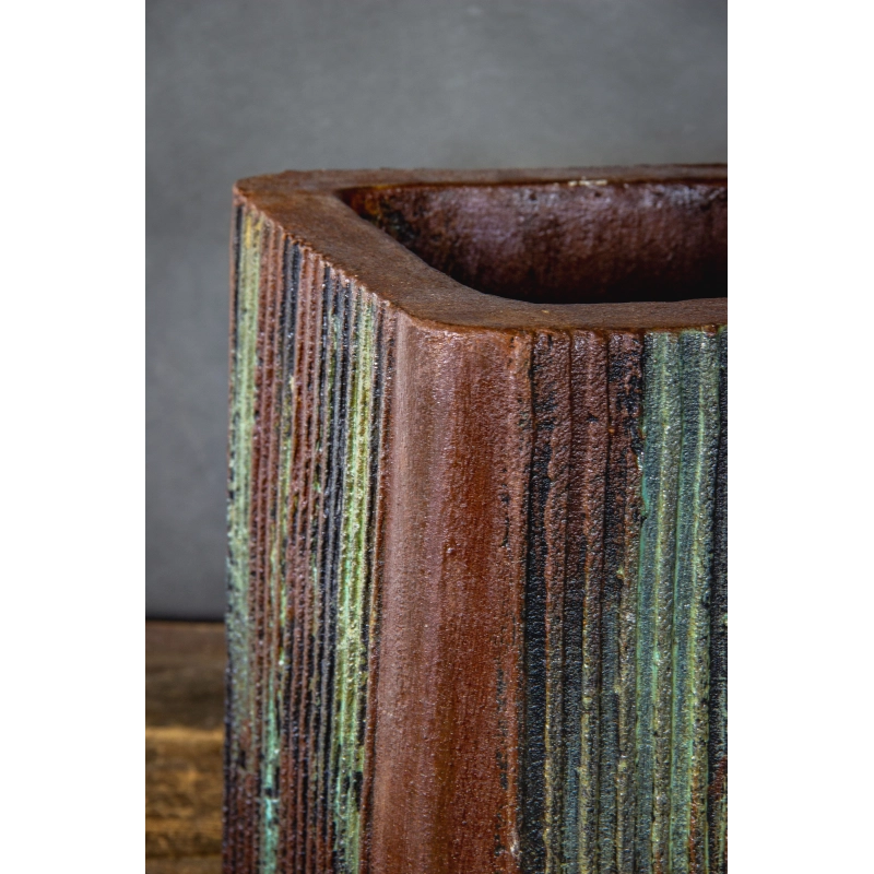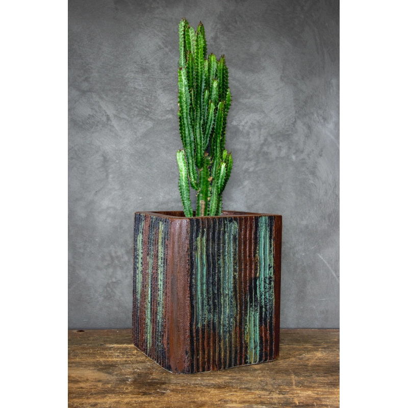 Osłonka na doniczkę loft 25 × 25 × 30 cm to wyjątkowy dodatek, który łączy w sobie industrialny charakter i artystyczny detal. Rdzawa powierzchnia inspirowana efektem kortenu została wzbogacona pionowymi paskami 3D w odcieniach patynowanej zieleni i turkusu, tworząc efekt głębi i struktury.