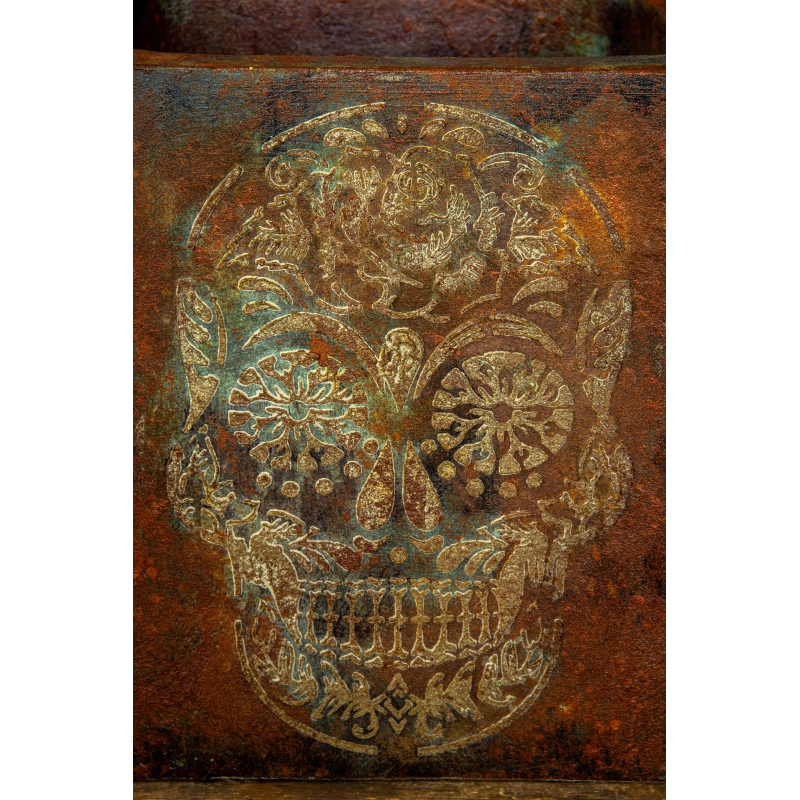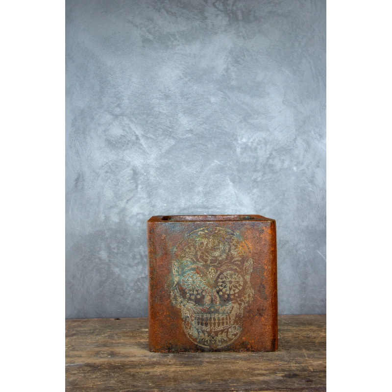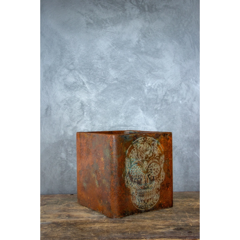 Kwadratowa osłonka na doniczkę loft 30 × 30 × 30 cm w efekcie kortenu to wyjątkowy, ręcznie wykonany element dekoracyjny. Surowa, rdzawa powierzchnia została uzupełniona dekoracyjnym motywem czaszki 3D, tworząc industrialny i artystyczny akcent.