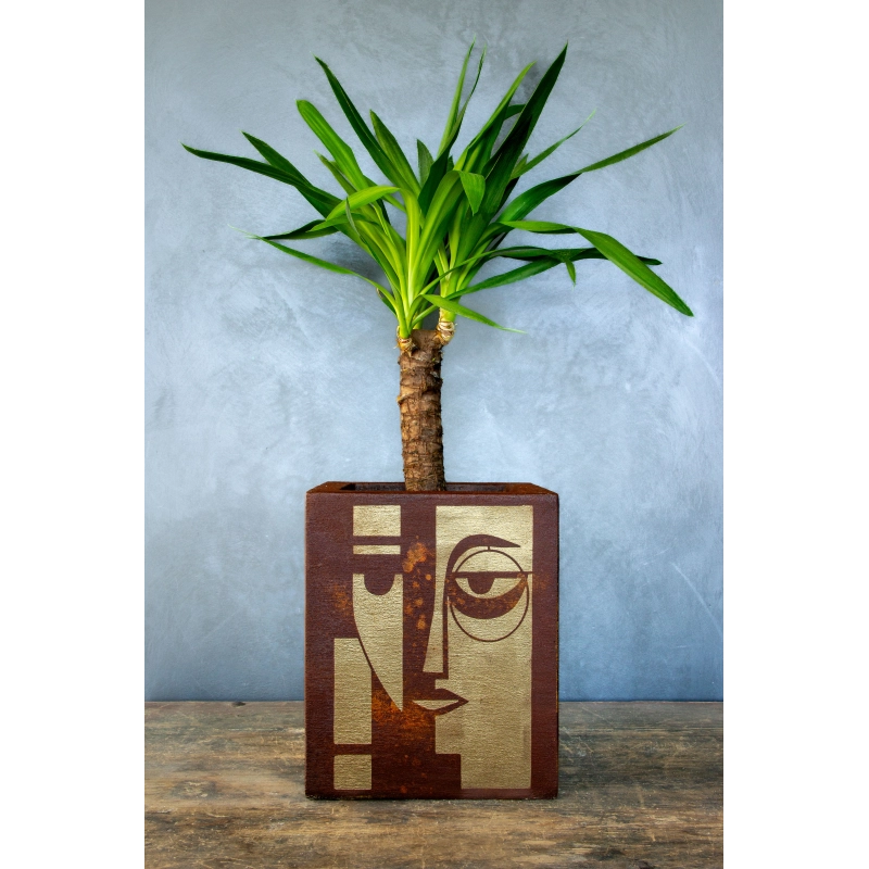 Industrialny efekt kortenu zestawiony ze złotym, geometrycznym wzorem twarzy tworzy estetykę, która wyróżnia się na tle masowej produkcji. To donica dla osób, które szukają czegoś więcej niż zwykłego dodatku – wybierają ręczne wykonanie, indywidualny charakter i sztukę użytkową. Donica loft to designerski dodatek łączący artystyczną ilustrację ze stylowym efektem kortenu.