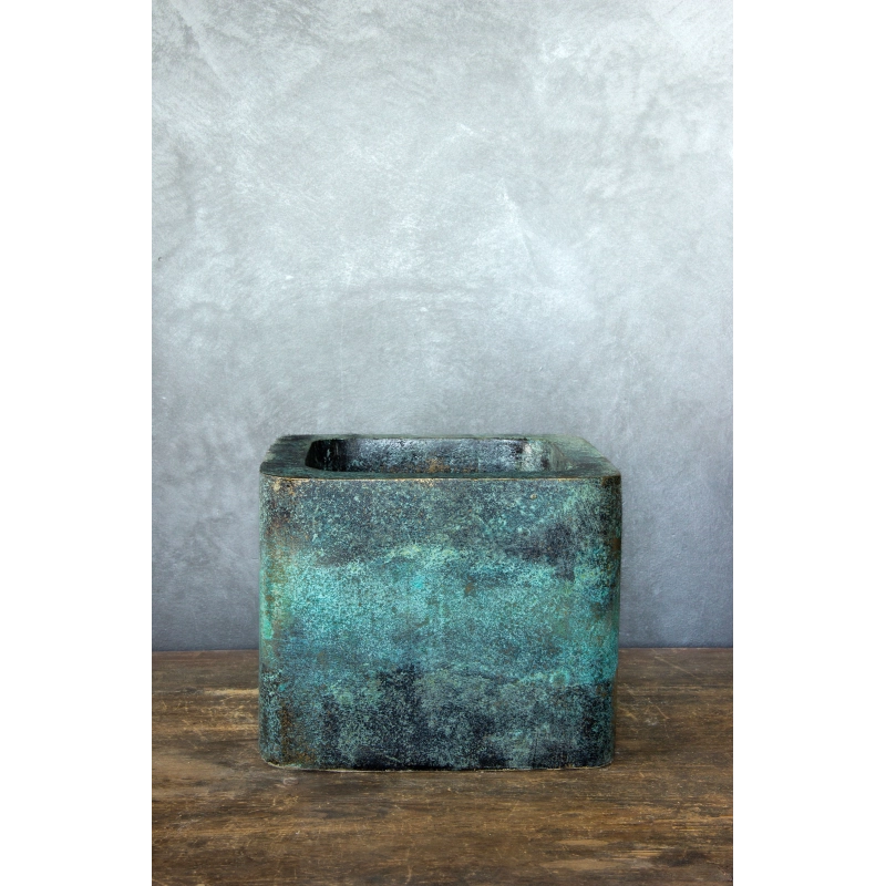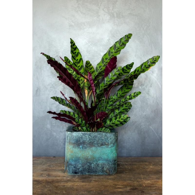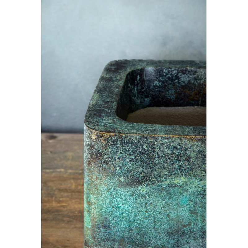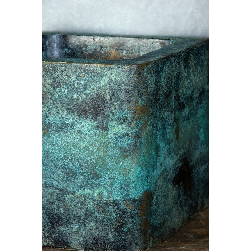 Ta osłonka na doniczkę zachwyca unikatowym wykończeniem w efekcie kortenu połączonym z intensywną, turkusową patyną. Jej powierzchnia, ręcznie formowana i malowana, tworzy niezwykle efektowną teksturę inspirowaną postarzanym metalem i naturalnym procesem oksydacji.