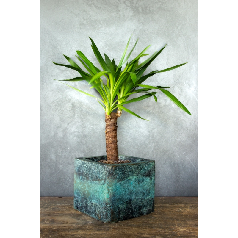 Ręcznie wykonana osłonka na doniczkę w efekcie kortenu z intensywną turkusową patyną. Odporna na wodę i promieniowanie UV, idealna do wnętrz i zakrytych tarasów.