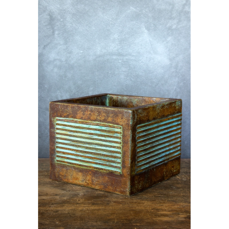 Osłonka na doniczkę z liniowym wzorem 3D 25 × 25 × 21 cm – rustykalna, ręcznie malowana, efekt kortenu