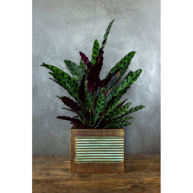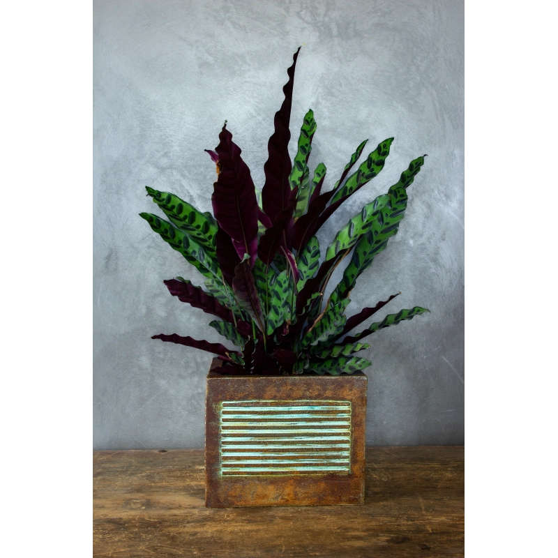 Ręcznie wykonana osłonka na doniczkę z geometrycznym wzorem liniowym 3D. Wykończona efektem kortenu z turkusową patyną. Odporna na wodę i promieniowanie UV, idealna do wnętrz i zakrytych tarasów.