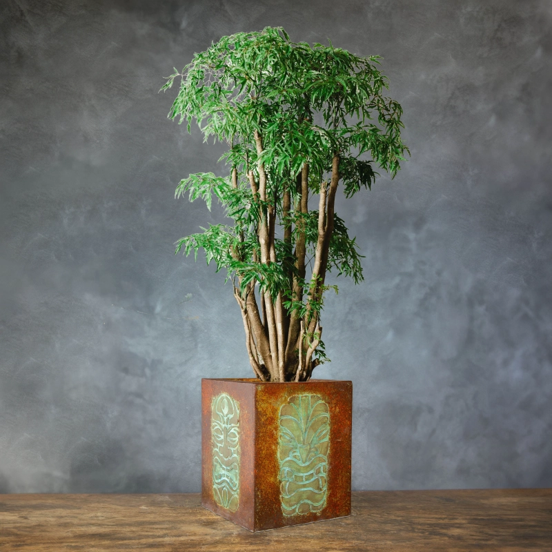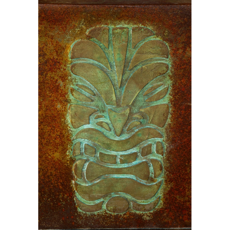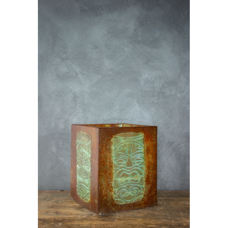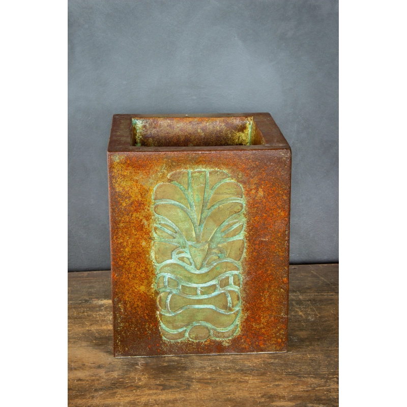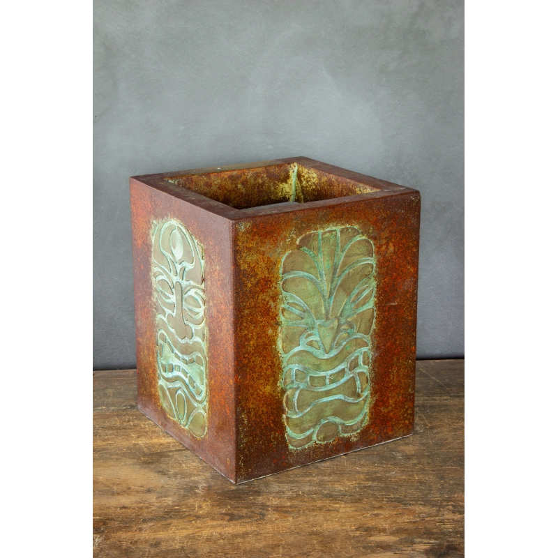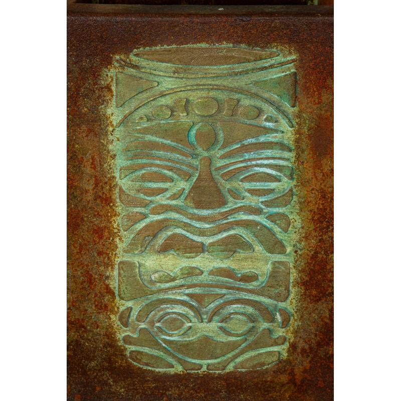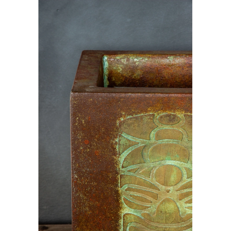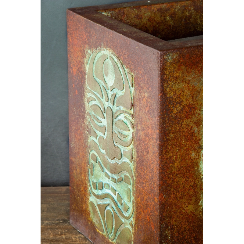Ręcznie wykonana osłonka na doniczkę z wypukłym wzorem 3D inspirowanym totemami. Pokryta wielowarstwową, przecieraną patyną w odcieniach turkusu, rdzy i antycznego metalu. Odporna na wodę i UV. Idealna do wnętrz i zadaszonych tarasów.