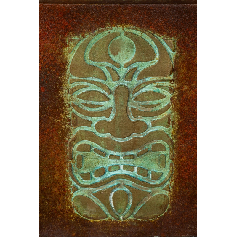 Jej powierzchnia została wykończona wielowarstwową, przecieraną techniką malarską. Połączenie turkusowej śniedzi, rdzawych tonów oraz złocistych akcentów tworzy efekt antycznego metalu, przypominającego naturalne procesy oksydacji i patynowania metali szlachetnych.