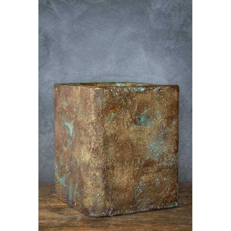 Jej wyrazisty, metaliczno-postarzany charakter pięknie kontrastuje z zielenią roślin, a dzięki wodoodpornemu i UV-odpornemu wykończeniu może zdobić również zakryte tarasy.