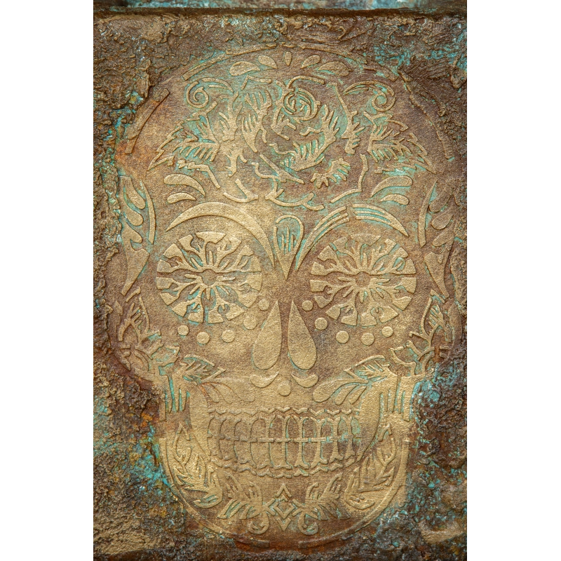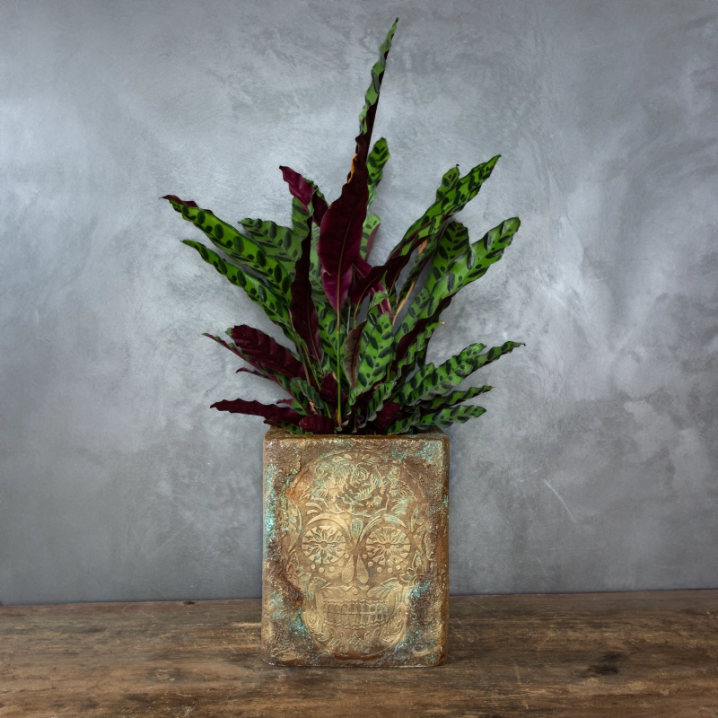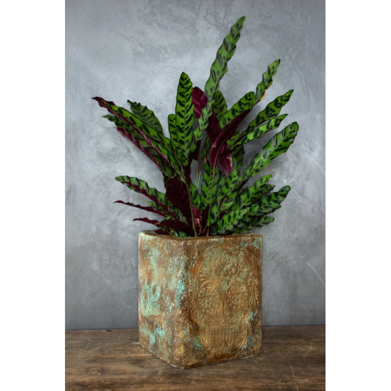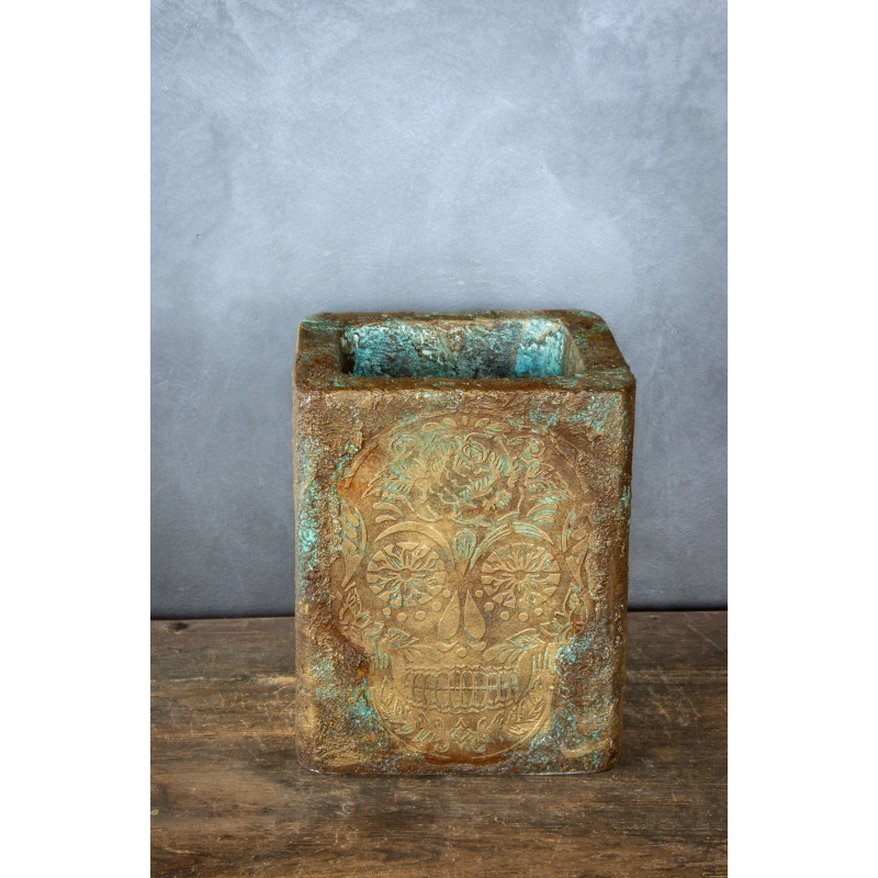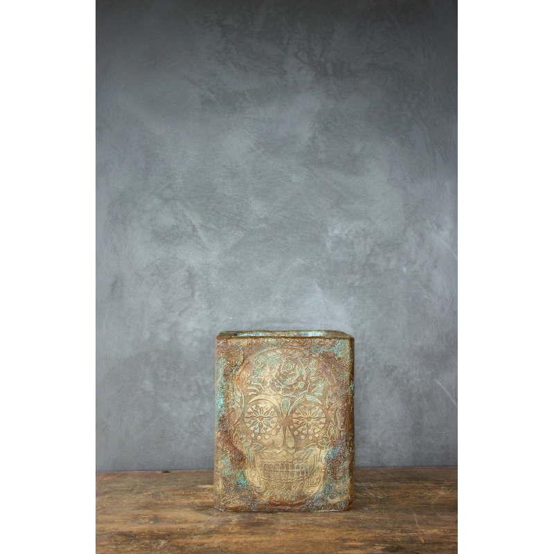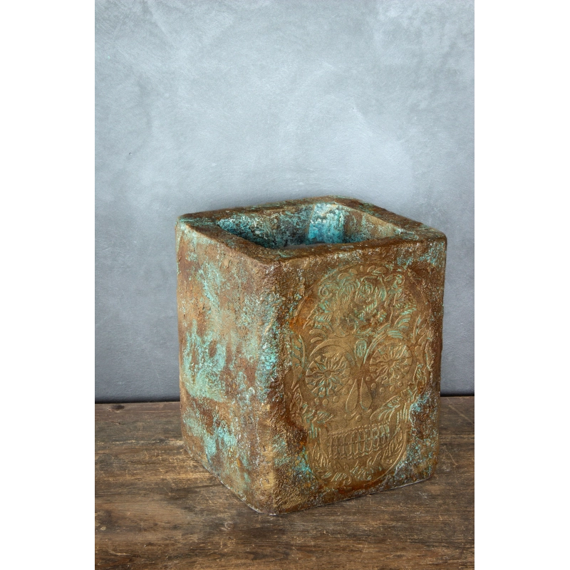 Ręcznie wykonana osłonka na doniczkę z trójwymiarowym motywem czaszki. Wykończona w efekcie rdzawego metalu z turkusową patyną (corten-look). Odporna na wodę i UV, idealna do wnętrz i zadaszonych tarasów.
