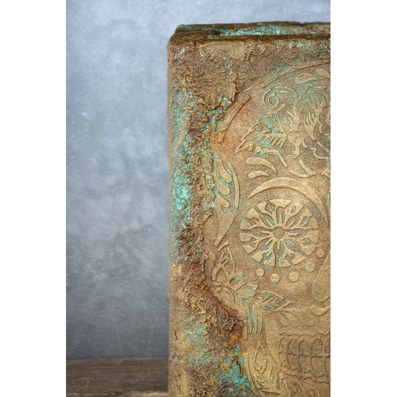 Unikalny design z artystyczną ornamentyką i turkusową patyną