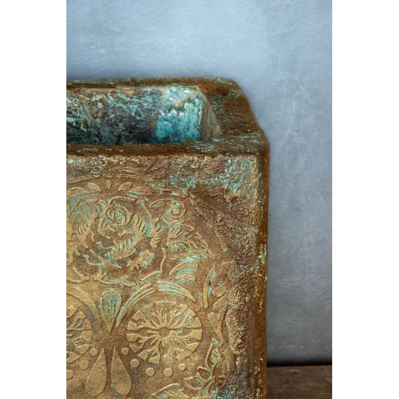 Powierzchnia wykończona została w efekcie rdzawego metalu z turkusową patyną (corten-look), co tworzy wrażenie elegancko postarzonej stali. Naturalnie wyglądające przejścia kolorystyczne, metaliczne przetarcia i patynowe akcenty nadają osłonce luksusowego, industrialno-artystycznego charakteru.