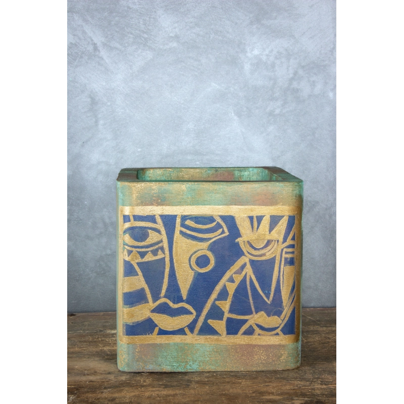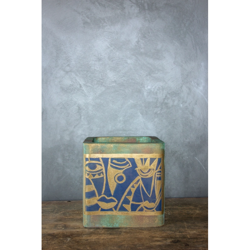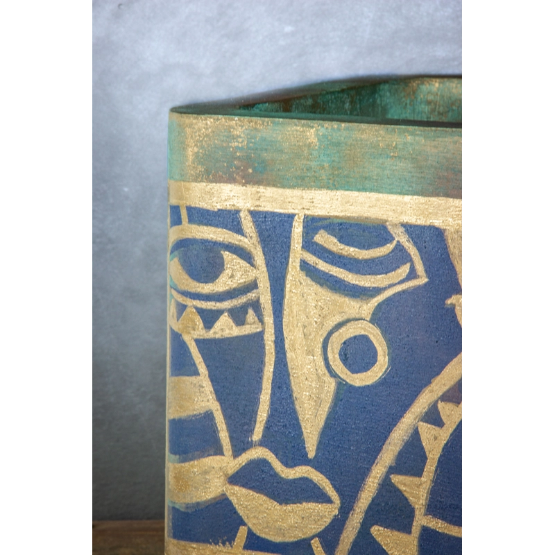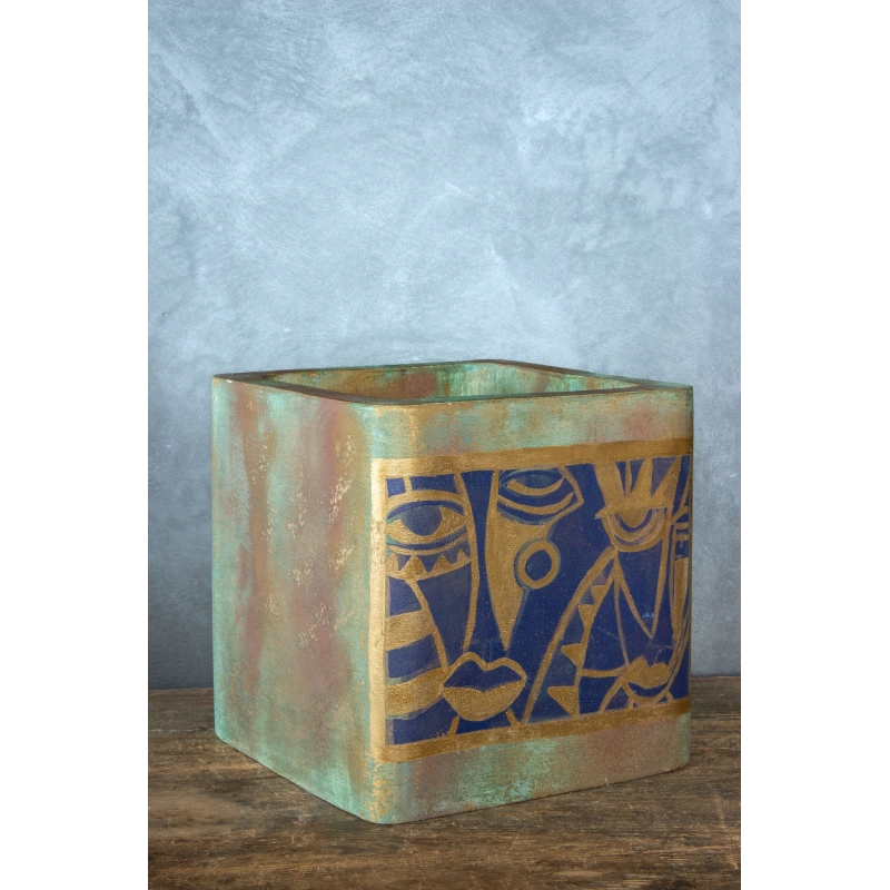 Ta osłonka na doniczkę to designerski dodatek o wyjątkowym charakterze. Ręczne wykonanie, wyrazista abstrakcyjna grafika, złote akcenty i turkusowa patyna sprawiają, że staje się nie tylko elementem funkcjonalnym, ale także wyrazem stylu. Idealna do wnętrz i zakrytych tarasów.