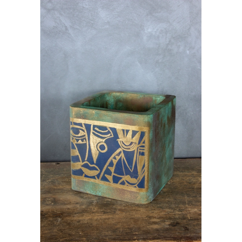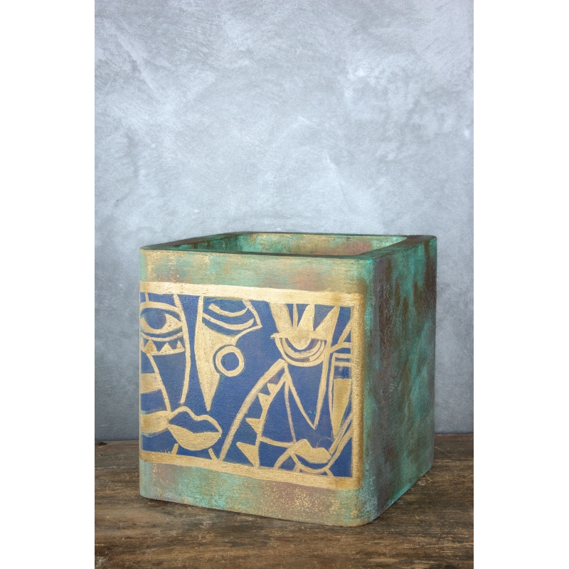 Ręcznie wykonana osłonka na doniczkę z artystycznym motywem inspirowanym sztuką abstrakcyjną. Wykończona w efekcie postarzanej, metalicznej powierzchni z turkusową patyną, odporna na wodę i UV. Idealna do wnętrz i zakrytych tarasów.