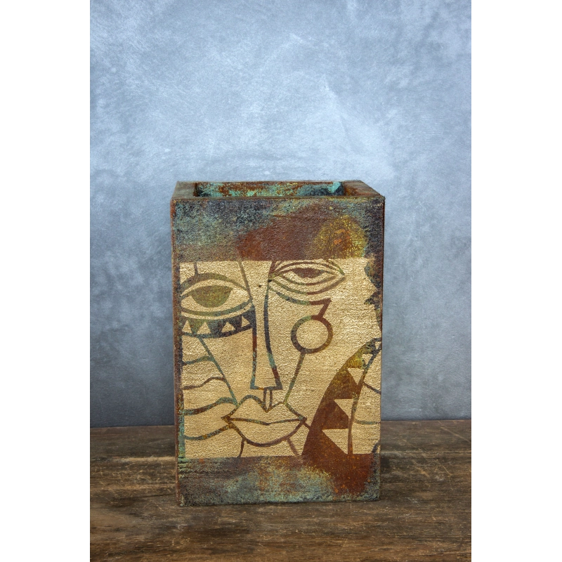 Ekskluzywna, ręcznie wykonana osłonka na doniczkę z unikalnym motywem artystycznym inspirowanym sztuką współczesną. Wykończona złotą aplikacją oraz efektowną powierzchnią imitującą korten z turkusową patyną. Trwała, wodoodporna i odporna na UV. Idealna do eleganckich wnętrz oraz stylowych, zadaszonych tarasów.