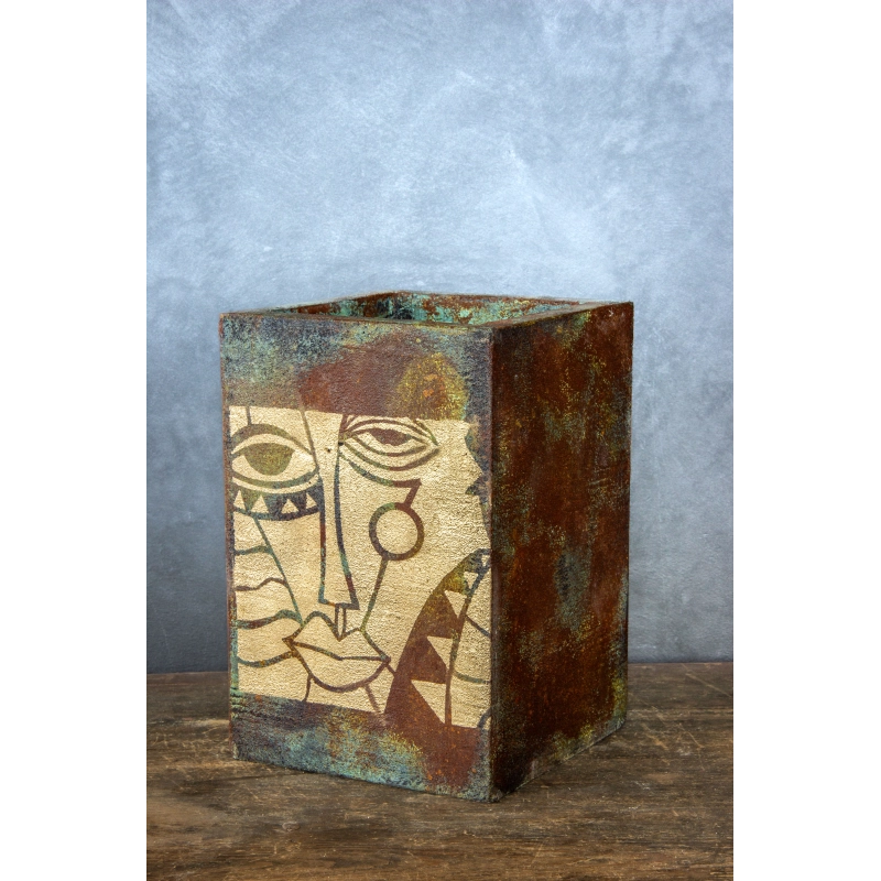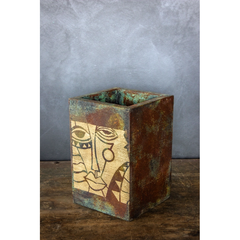 Ta luksusowa osłonka na doniczkę to wyjątkowe dzieło rzemiosła artystycznego, zaprojektowane z myślą o osobach, które cenią sztukę, unikalność i nowoczesny design. Jej geometryczna forma stanowi harmonijną bazę dla ręcznie malowanego motywu inspirowanego sztuką współczesną. Złota ilustracja twarzy, wykonana z precyzją i dbałością o detal, przyciąga wzrok i nadaje osłonce charakteru ekskluzywnego obiektu dekoracyjnego.