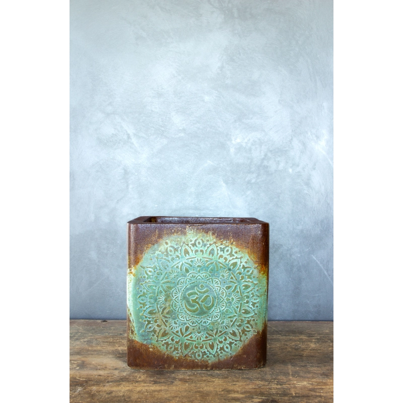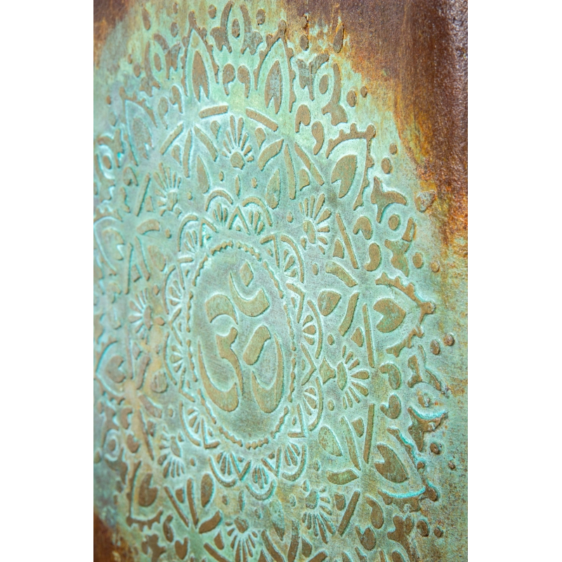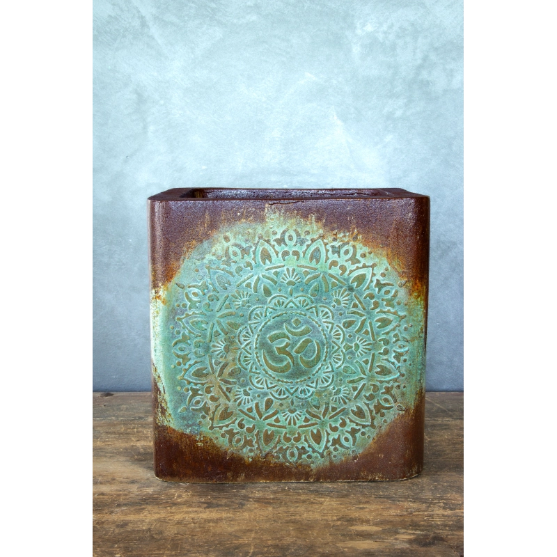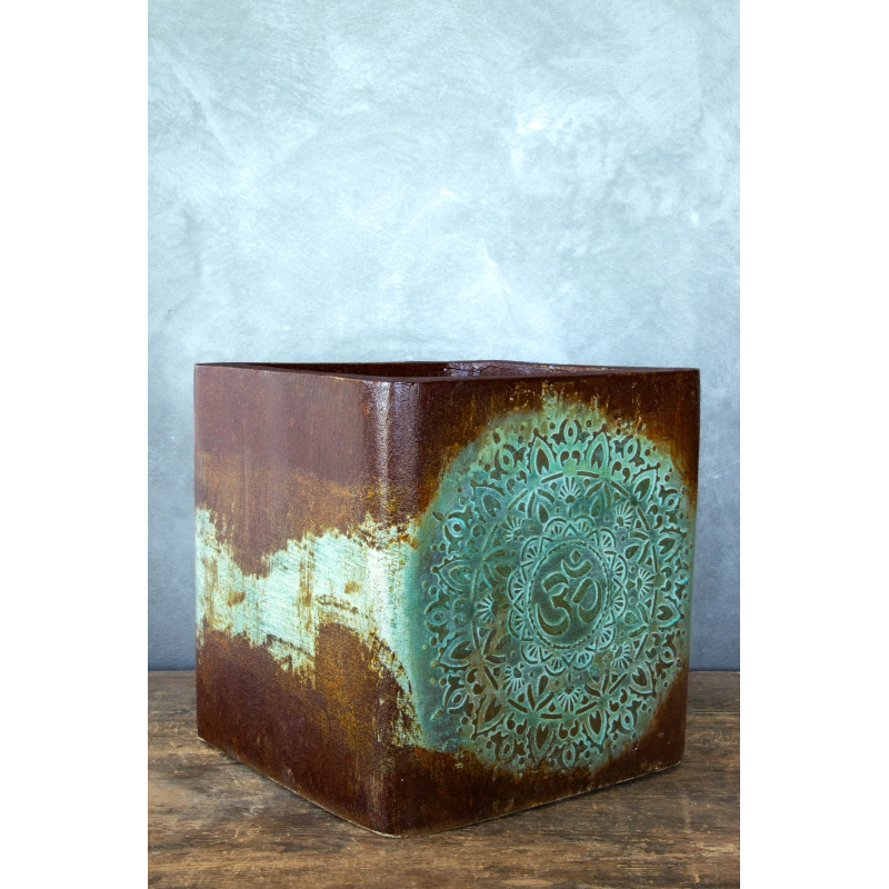 Ekskluzywna, ręcznie wykonana osłonka na doniczkę z artystycznym reliefem przedstawiającym symbol OM – znak harmonii, jedności i duchowej równowagi. Wykończona spektakularnym efektem kortenu z głęboką, turkusową patyną, zachwyca unikatową teksturą i głębią barw. W pełni odporna na wodę i UV, idealna do eleganckich wnętrz, przestrzeni medytacyjnych oraz stylowych tarasów.