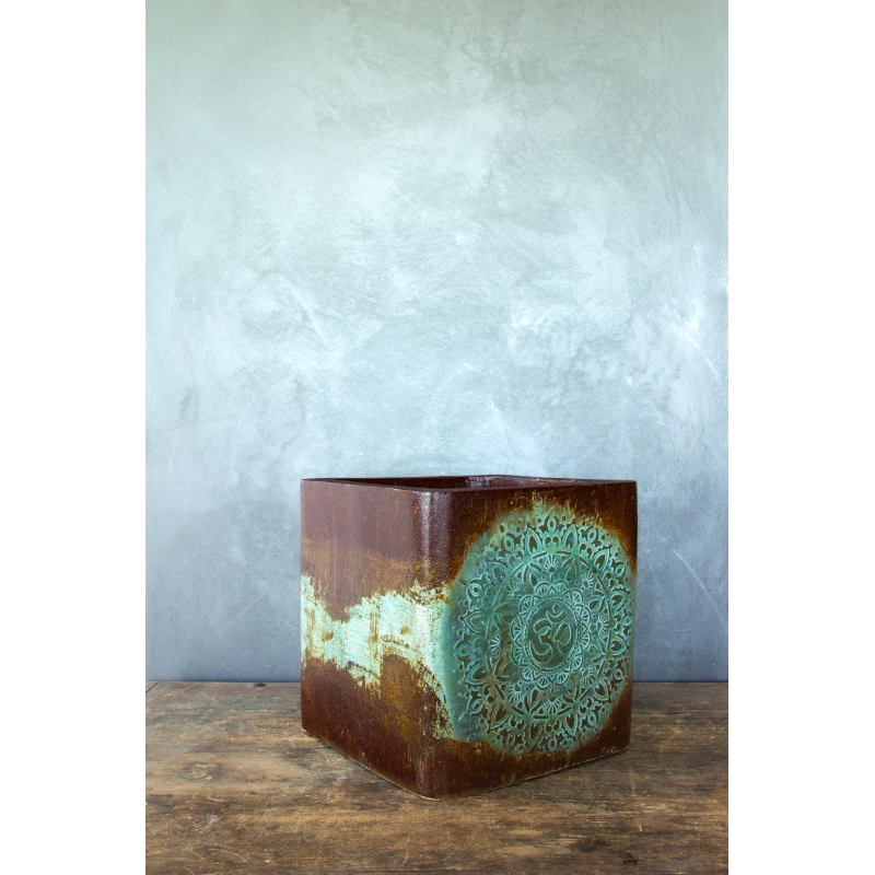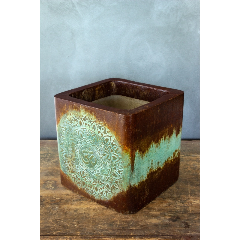 Luksusowa osłonka na doniczkę z symbolem OM 30 × 30 × 30 cm – efekt kortenu, ręcznie wykonana