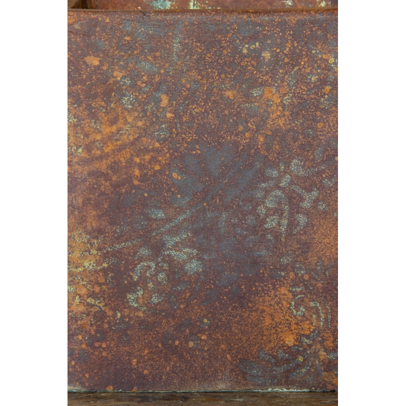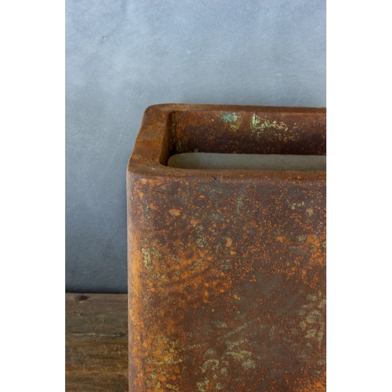 Ręcznie wykonana osłonka na doniczkę z efektem naturalnej rdzy kortenowej. Bogata, wielowarstwowa tekstura i delikatne przetarcia nadają jej charakter autentycznego, industrialnego rzemiosła. Odporna na wodę i promieniowanie UV. Idealna do wnętrz i zakrytych tarasów.