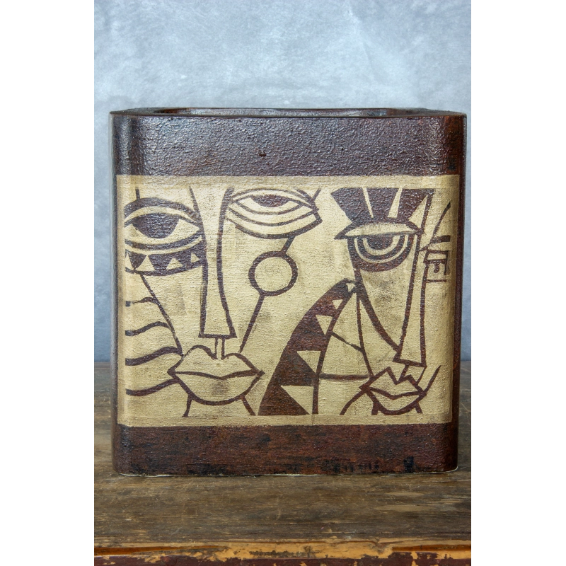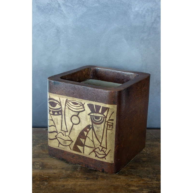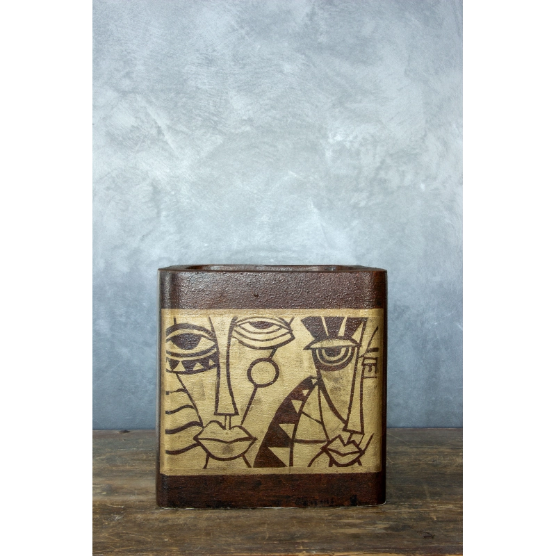 Ręcznie wykonana osłonka na doniczkę z artystycznym motywem abstrakcyjnych twarzy. Efekt kortenu połączony z kremową płaszczyzną dekoracyjną tworzy elegancki kontrast o unikatowym charakterze. Wodoodporna i odporna na UV, idealna do wnętrz i zakrytych tarasów.