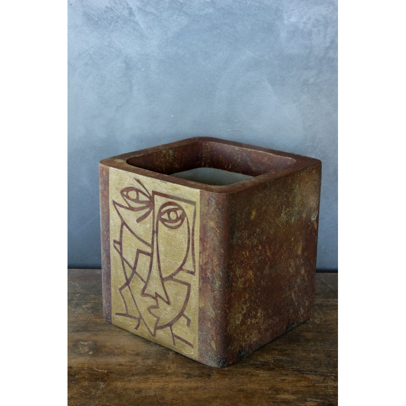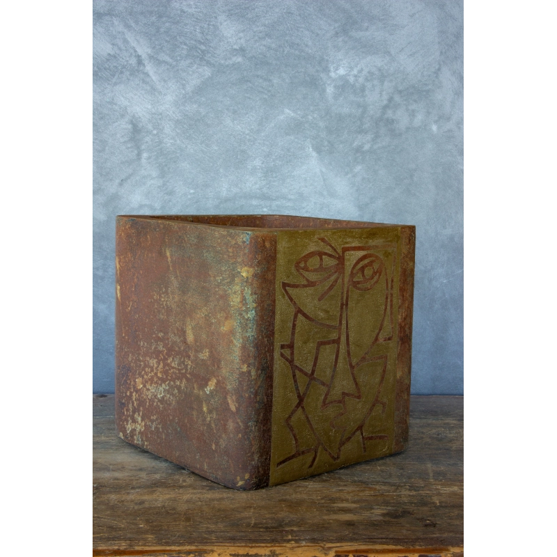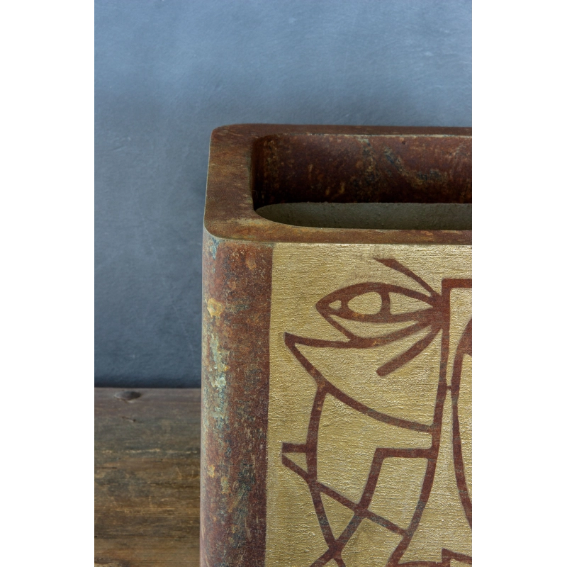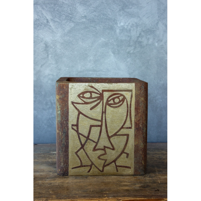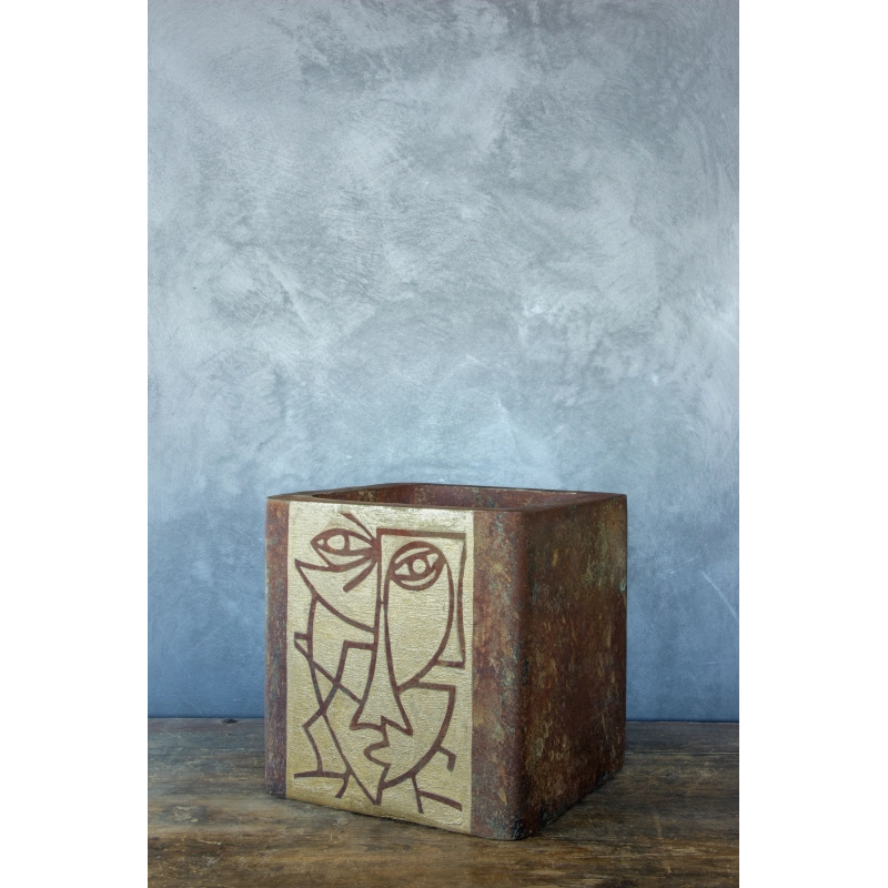 Ręcznie wykonana osłonka o wymiarach 30 × 30 × 30 cm, utrzymana w efekcie cortenu z turkusowo-zieloną patyną. Jej front zdobi minimalistyczny, linearno-geometryczny motyw twarzy inspirowany sztuką współczesną. Wodoodporna i odporna na UV — idealna do wnętrz i zakrytych tarasów.