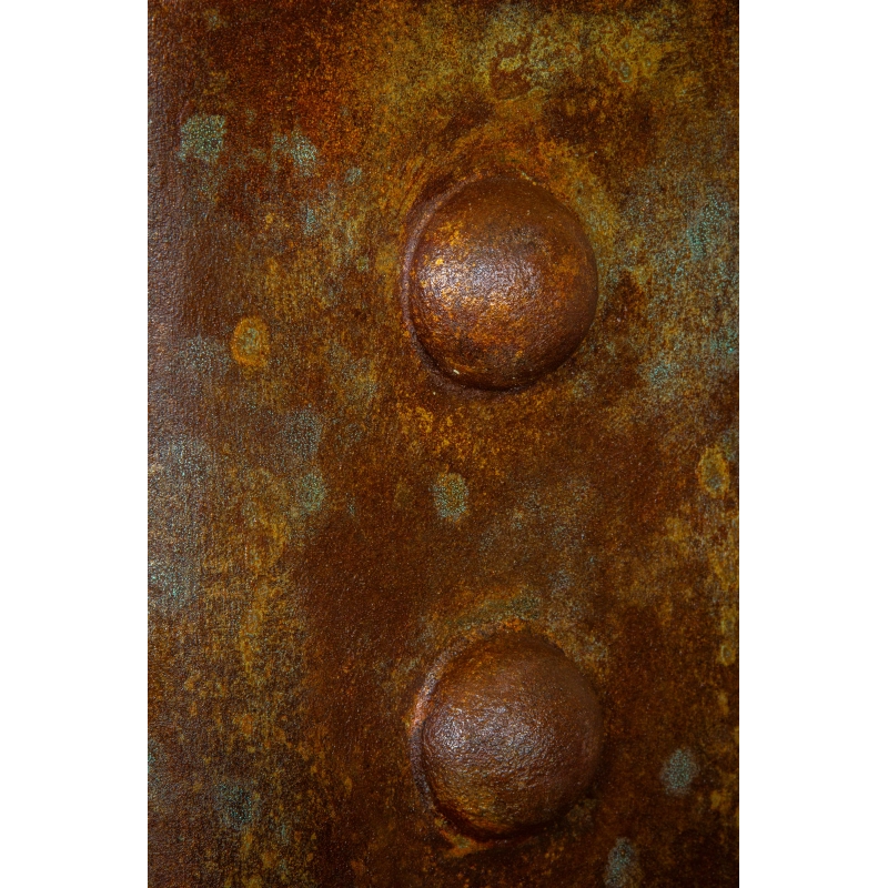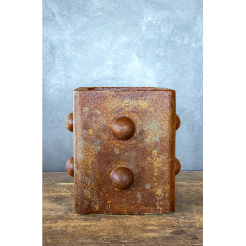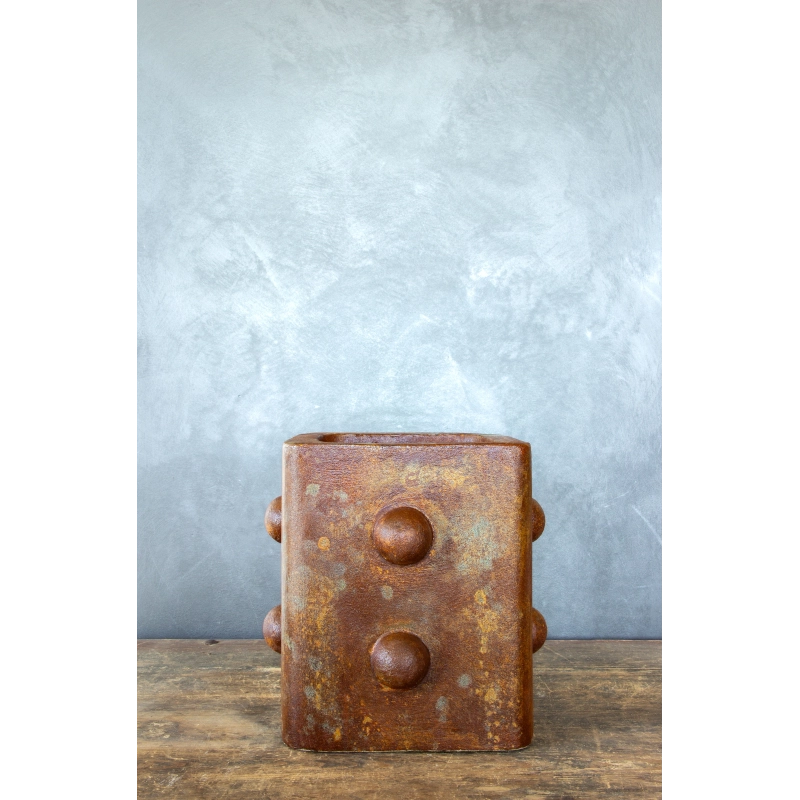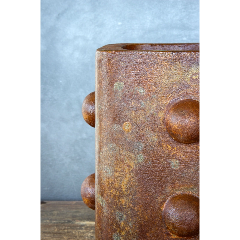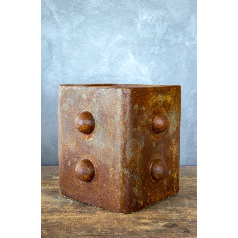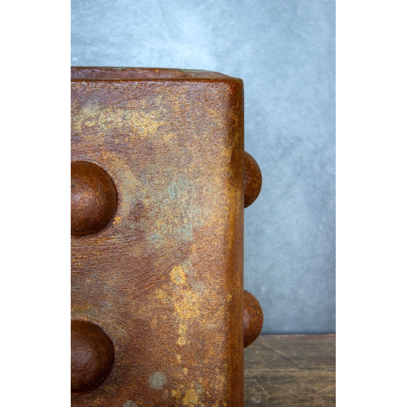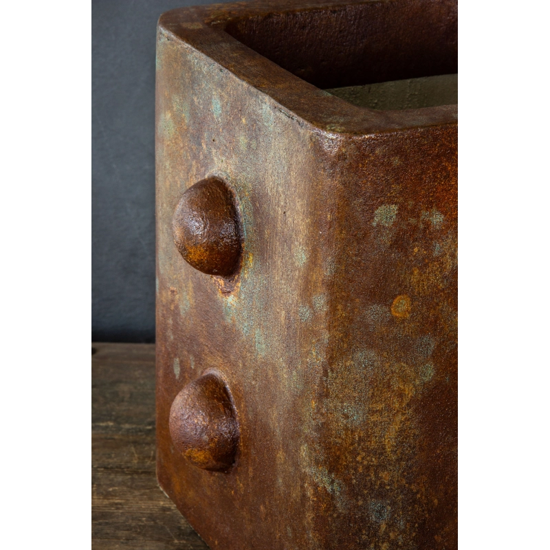 Ekskluzywna, ręcznie wykonana osłonka o industrialno-artystycznym charakterze, ozdobiona rzeźbiarskimi, wypukłymi formami 3D na wszystkich czterech ścianach. Wykończona spektakularnym efektem kortenu z subtelną turkusową patyną, zachwyca unikatową fakturą, głębią barw i wyjątkową wyrazistością form.